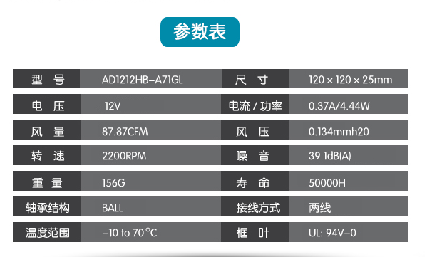 ADDA AD1212HB-A71GL 12V 0.37A 12厘米2線風(fēng)機
